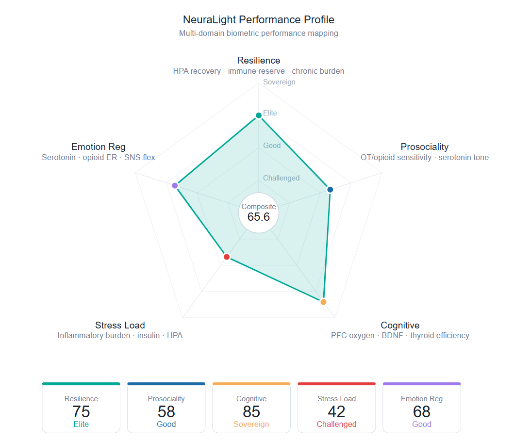 NeuraLight™ offers the only assessment that begins with your biomarker data — not a survey, not a self-report, not a personality type. Five neural domains. Four layers of evidence. One precise picture of how you actually perform.