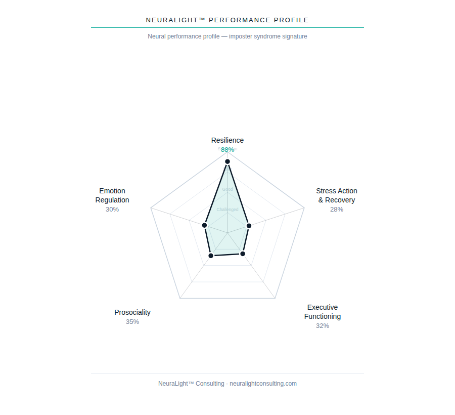 The first image below is an example of a balanced coach. While the stress load is a bit challenged, the HPA recovery is rapid; regulation is excellent; the other domains are robust enough to prevent collapse. The second image is the neural signature of imposter syndrome. It appears carried by Resilience domain. Stress recovery is slower, most domains are overtaxed.